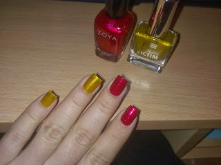 Макар все още да е топло и есенно, на мен вече ми се носят коледни цветове и реших да не се съобразявам с времето. От миналата седмица замислях да съм с комбинация злато и червено, та от няколко дни и се радвам. Определено лаковете са много красиви, фолиения завършек ги прави толкова "неустоими".